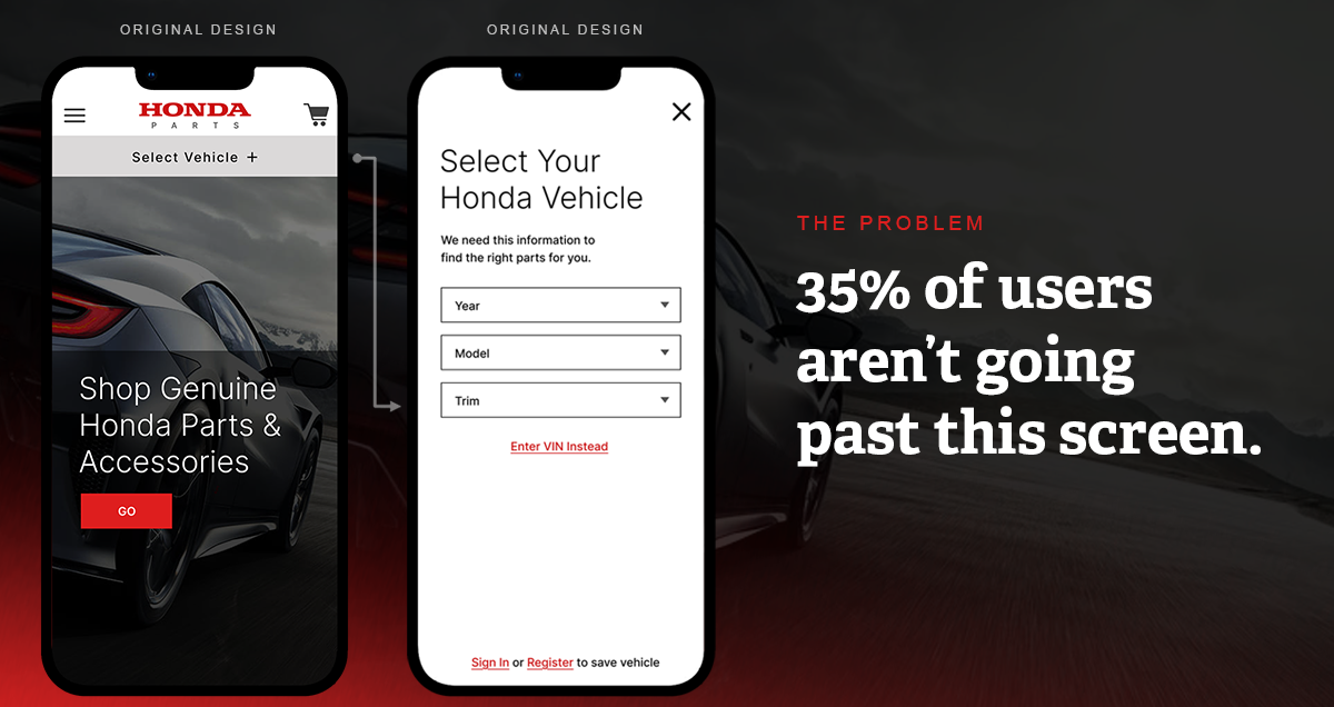 After 3 months, the most egregious stat we noticed is that 35% of users (175k per month) were abandoning our experience at the storefront. While this is a standard bounce rate for ecommerce in general it's abnormally high for a high-intent ecommerce site like Honda Parts.