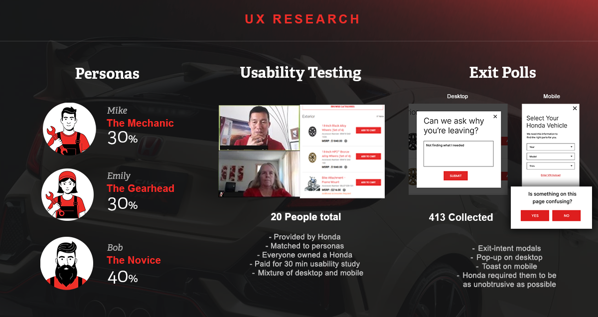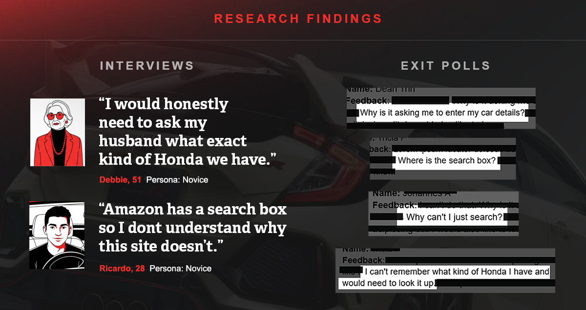 Honda was willing to hand us the contact information of about 50 people who would agree to being paid for a quick UX interview where we can watch their screen. It was important to interview someone who had a Honda car and was looking for Honda parts. Because we know of the 30-30-40 split of our personas, we made sure to match our interview pool to the same demographics. In the end we got 20 people signed up. During these interviews we had people go to the storefront and then asked "Can you find a new center console for your car?" "Can you find an electric charger for your car?" (And other questions like this)