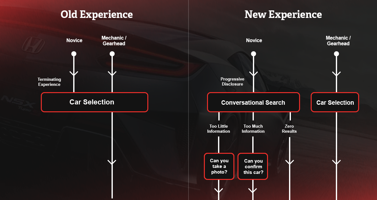 We were asking users to enter dull information about their car when they are looking for a search box. To put this another way: "When a user is looking for a hammer, give them a hammer." As mentioned earlier, we can't send users directly to unfiltered search results but perhaps a conversational AI would be more approachable.